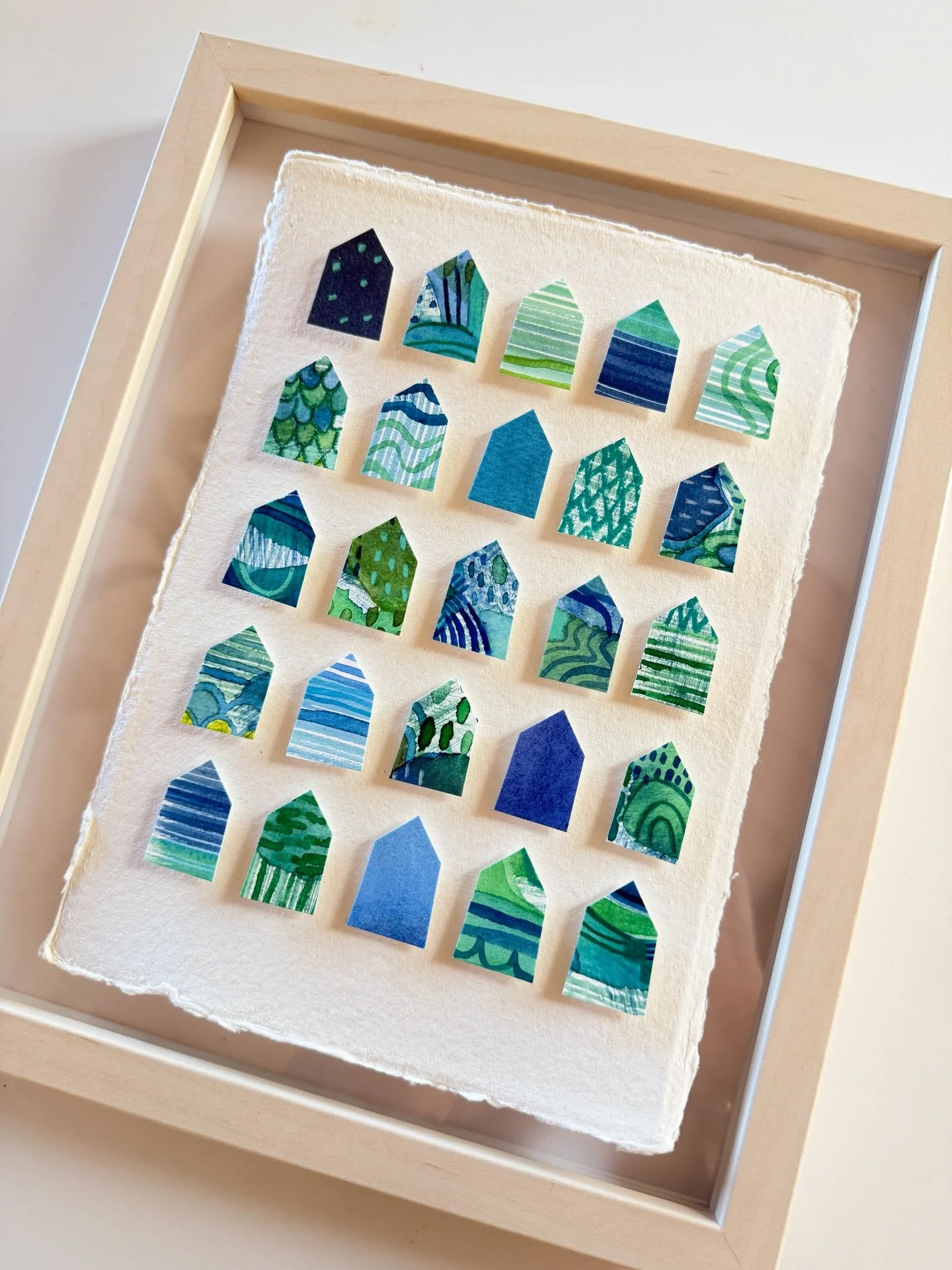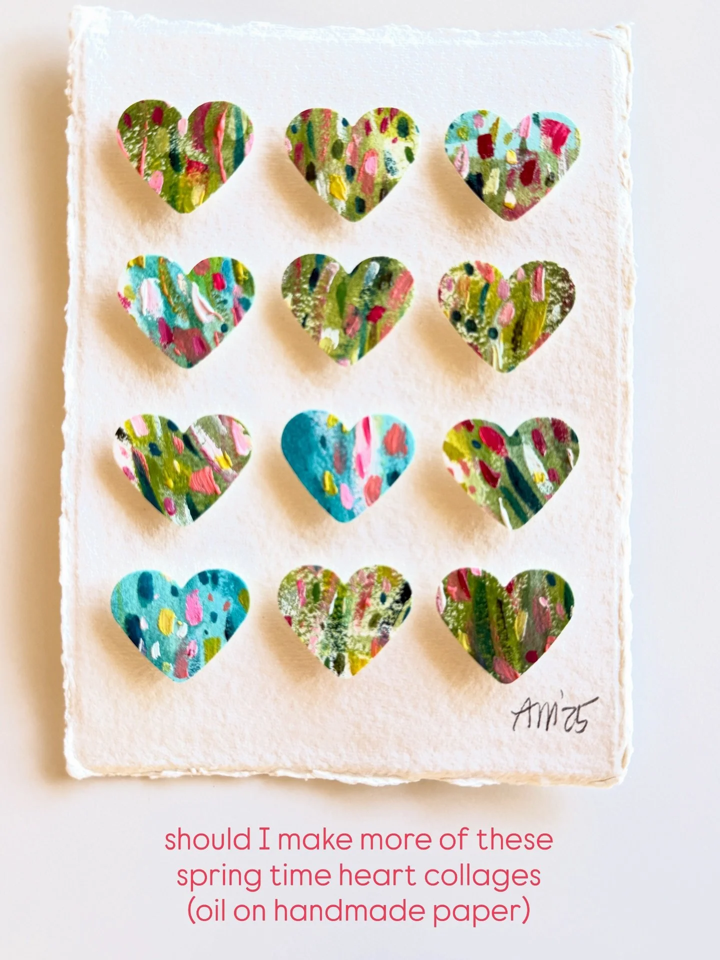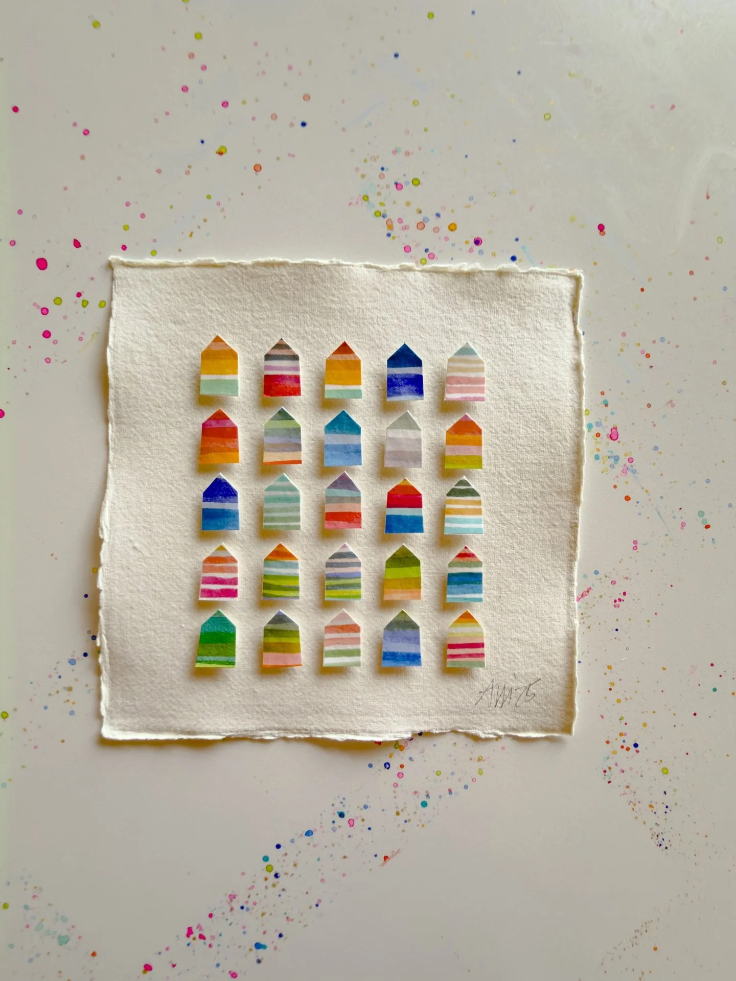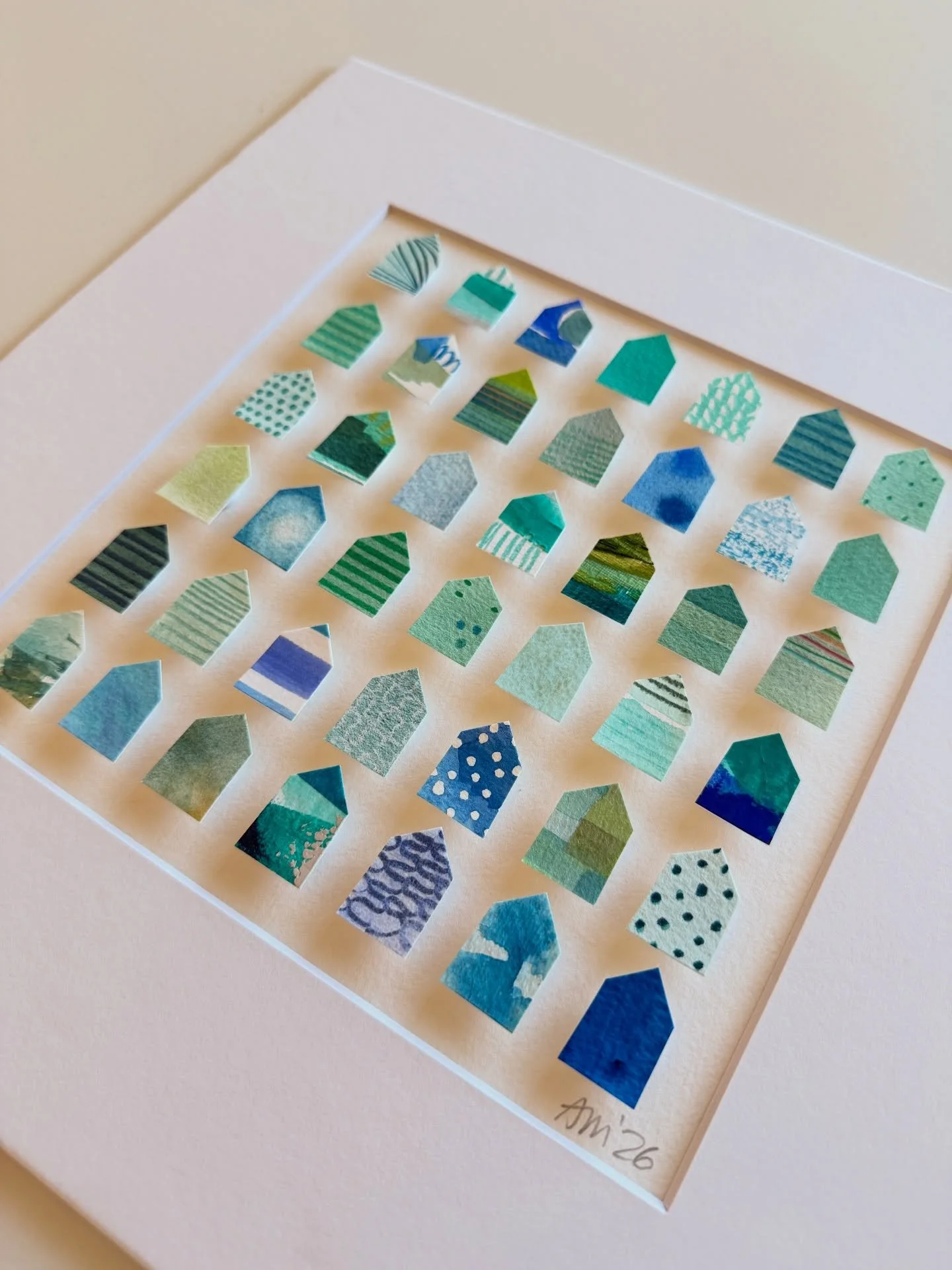 I am self-taught through personal experimentation with different mediums, and I have taken various online and in-person creative workshops with inspiring mentors and teachers. I've documented my children's lives as a scrapbooker, spent years photographing my family, friends, and clients, and since 2017 I've shared my creative art journey through my Instagram account, alexandramathias_art. I love experimenting with new mediums and different styles. I collect art books, art supplies, and "online art classes," and I thrive on my connections with fellow artists and my collectors on social media. While trying to define my style and find my niche, I realized that there was already a red thread weaving through all my artworks: my love of vibrant colors, repetitive mark-making, abstract art, and collage. Most of my current artworks are collage grids featuring my favorite motives: houses, hearts, and organic circle shapes. My artworks are collected throughout the US, Canada, Europe, and Japan.