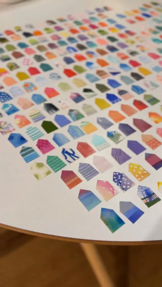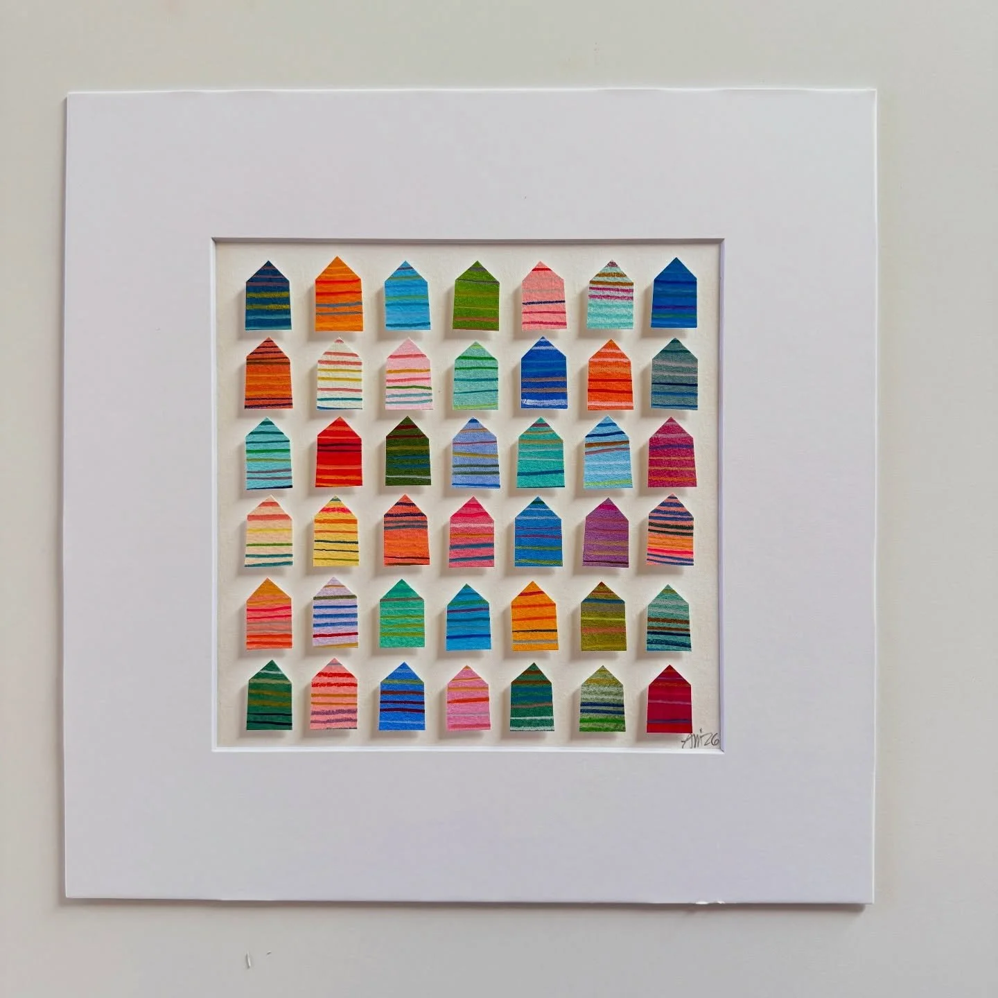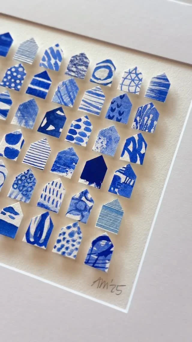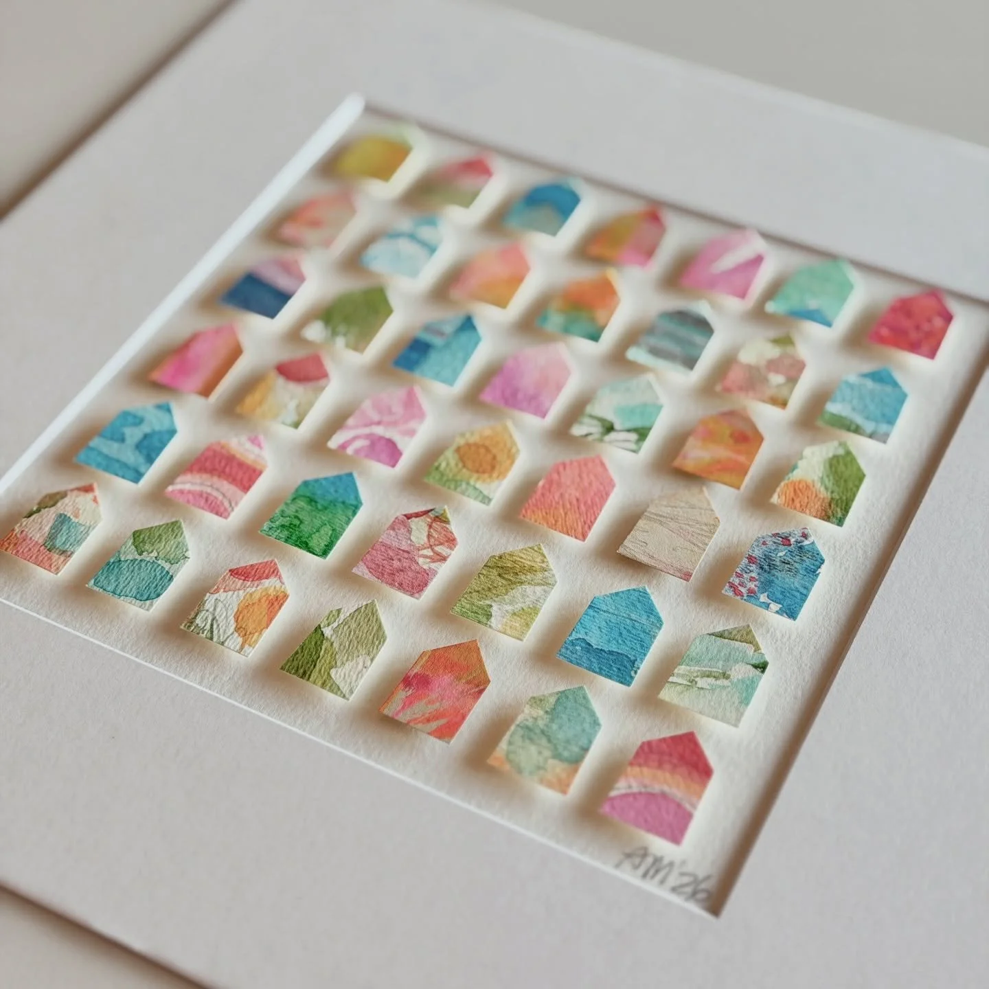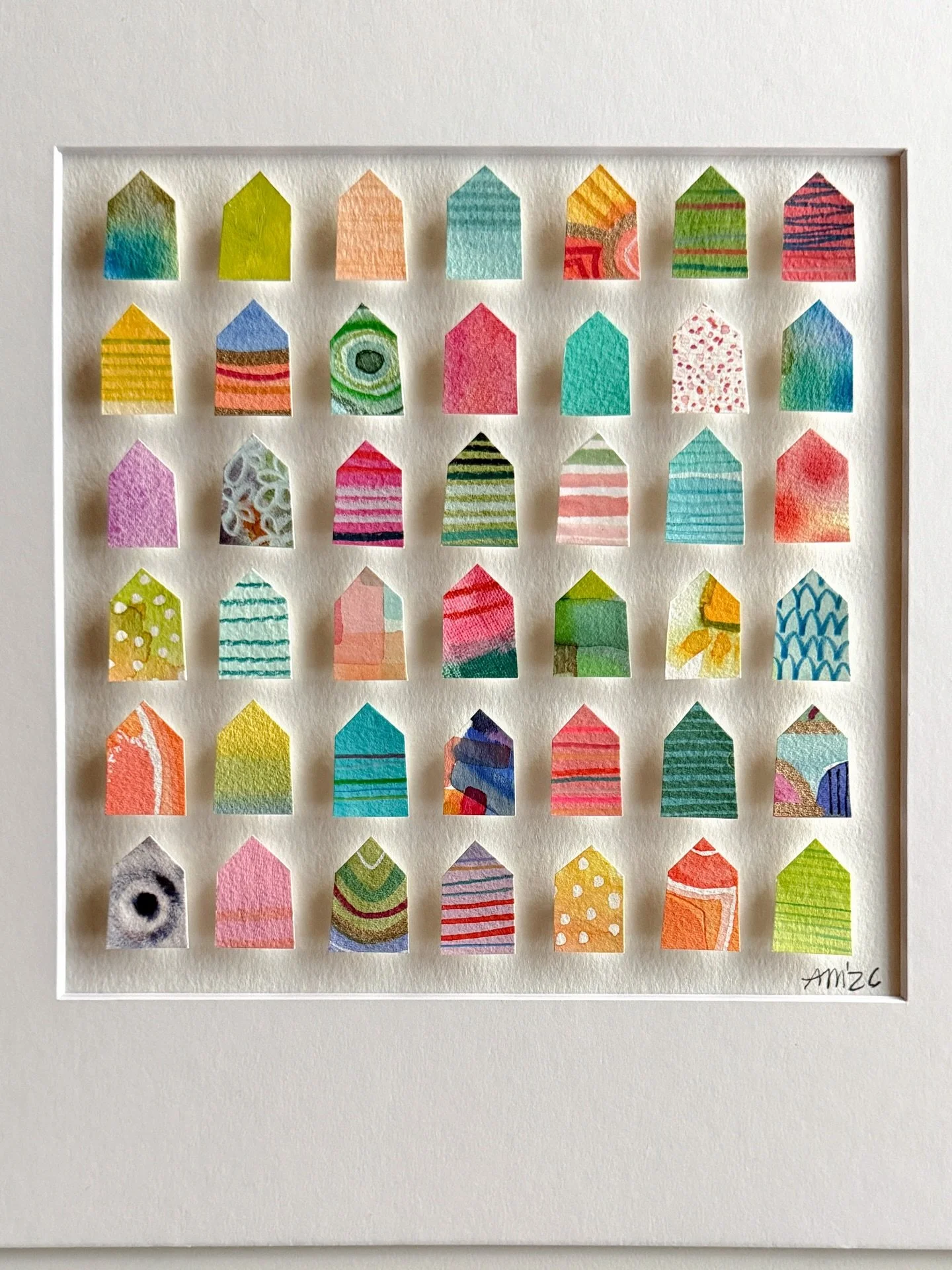 I am self-taught through personal experimentation with different mediums, and I have taken various online and in-person creative workshops with inspiring mentors and teachers. I've documented my children's lives as a scrapbooker, spent years photographing my family, friends, and clients, and since 2017 I've shared my creative art journey through my Instagram account, alexandramathias_art. I love experimenting with new mediums and different styles. I collect art books, art supplies, and "online art classes," and I thrive on my connections with fellow artists and my collectors on social media. While trying to define my style and find my niche, I realized that there was already a red thread weaving through all my artworks: my love of vibrant colors, repetitive mark-making, abstract art, and collage. Most of my current artworks are collage grids featuring my favorite motives: houses, hearts, and organic circle shapes. My artworks are collected throughout the US, Canada, Europe, and Japan.