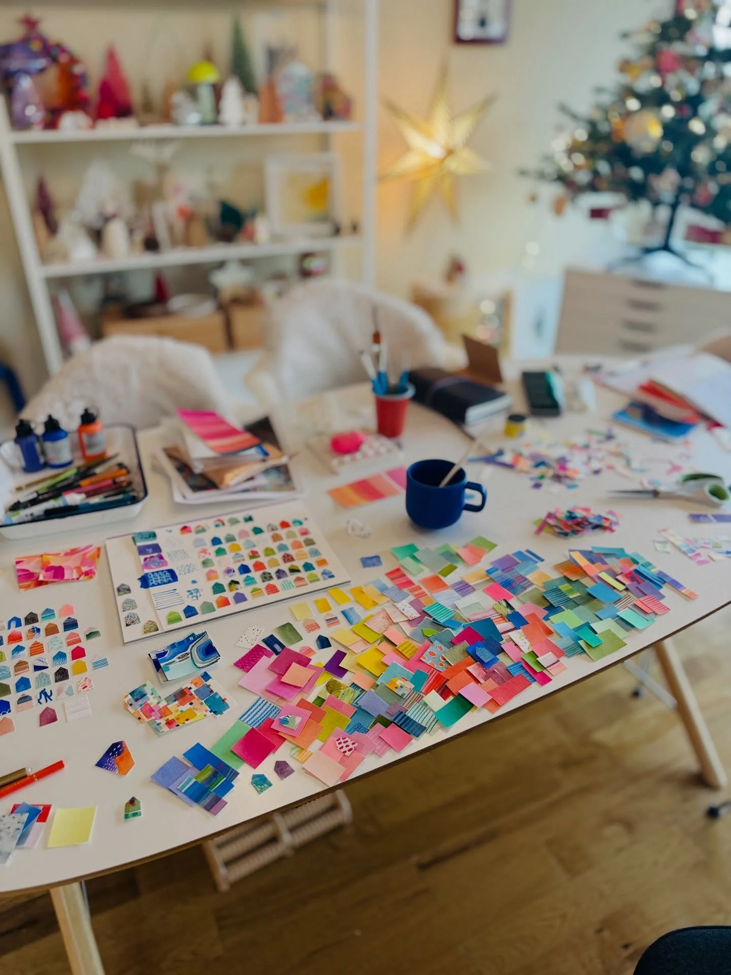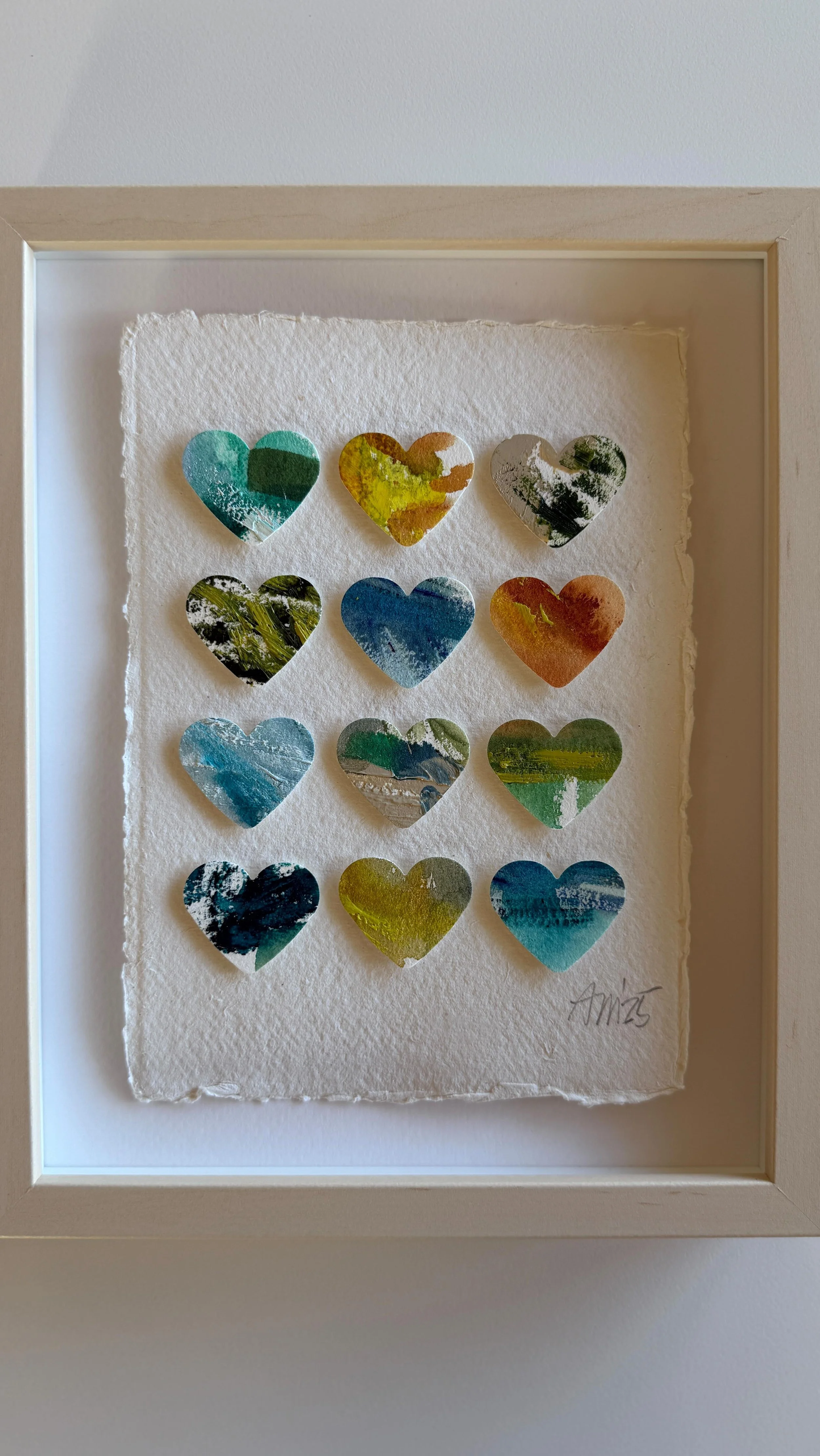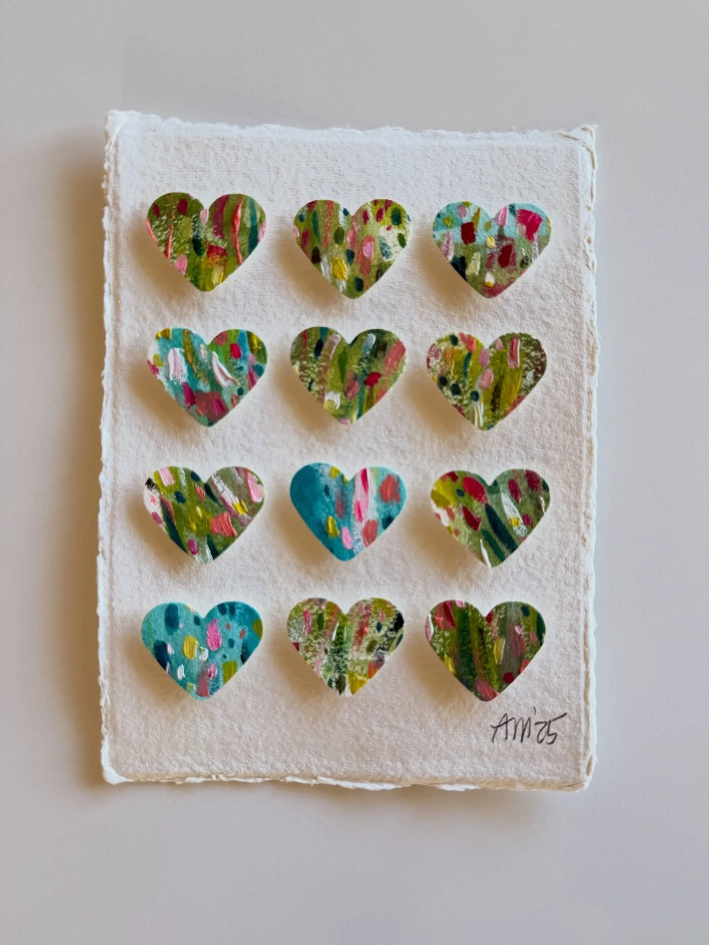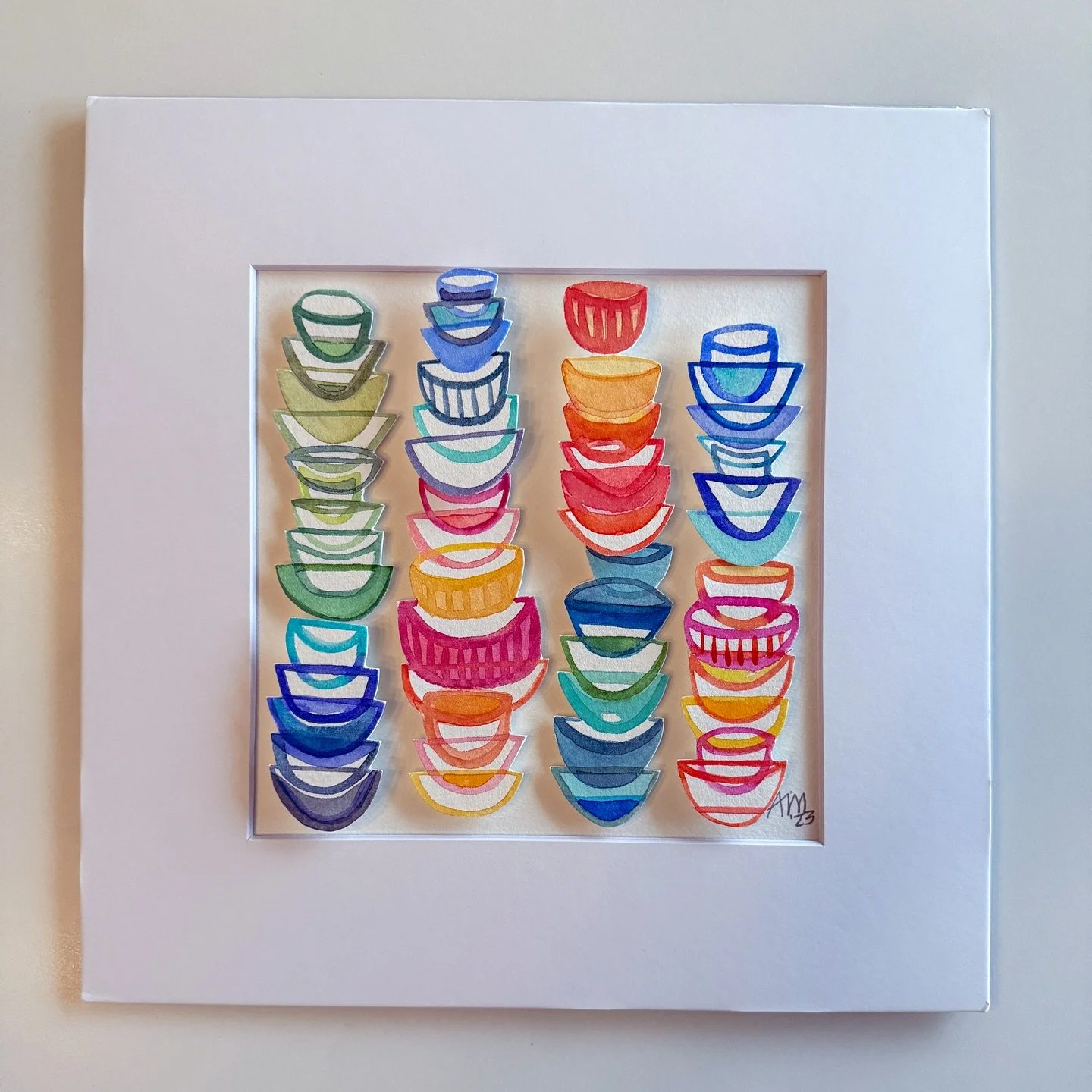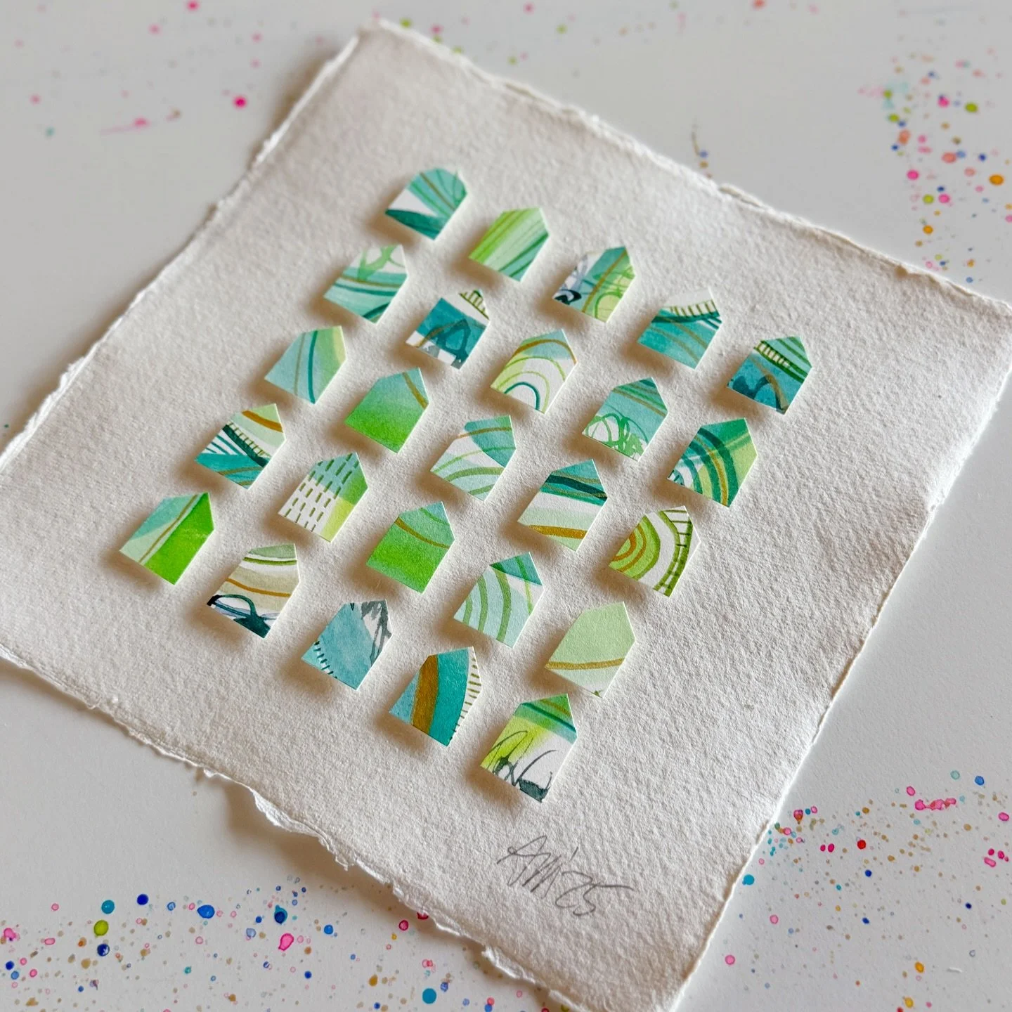 I am self-taught through personal experimentation with different mediums, and I have taken various online and in-person creative workshops with inspiring mentors and teachers. I've documented my children's lives as a scrapbooker, spent years photographing my family, friends, and clients, and since 2017 I've shared my creative art journey through my Instagram account, alexandramathias_art. I love experimenting with new mediums and different styles. I collect art books, art supplies, and "online art classes," and I thrive on my connections with fellow artists and my collectors on social media. While trying to define my style and find my niche, I realized that there was already a red thread weaving through all my artworks: my love of vibrant colors, repetitive mark-making, abstract art, and collage. Most of my current artworks are collage grids featuring my favorite motives: houses, hearts, and organic circle shapes. My artworks are collected throughout the US, Canada, Europe, and Japan.